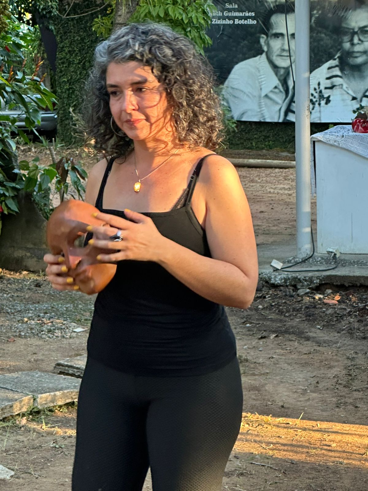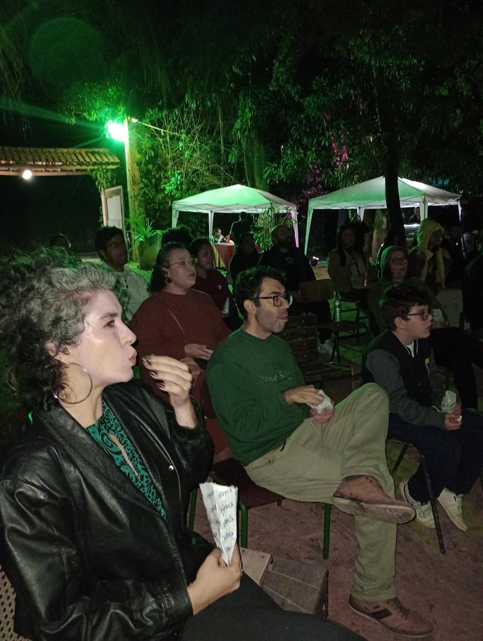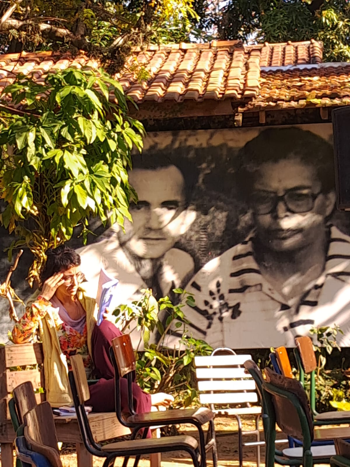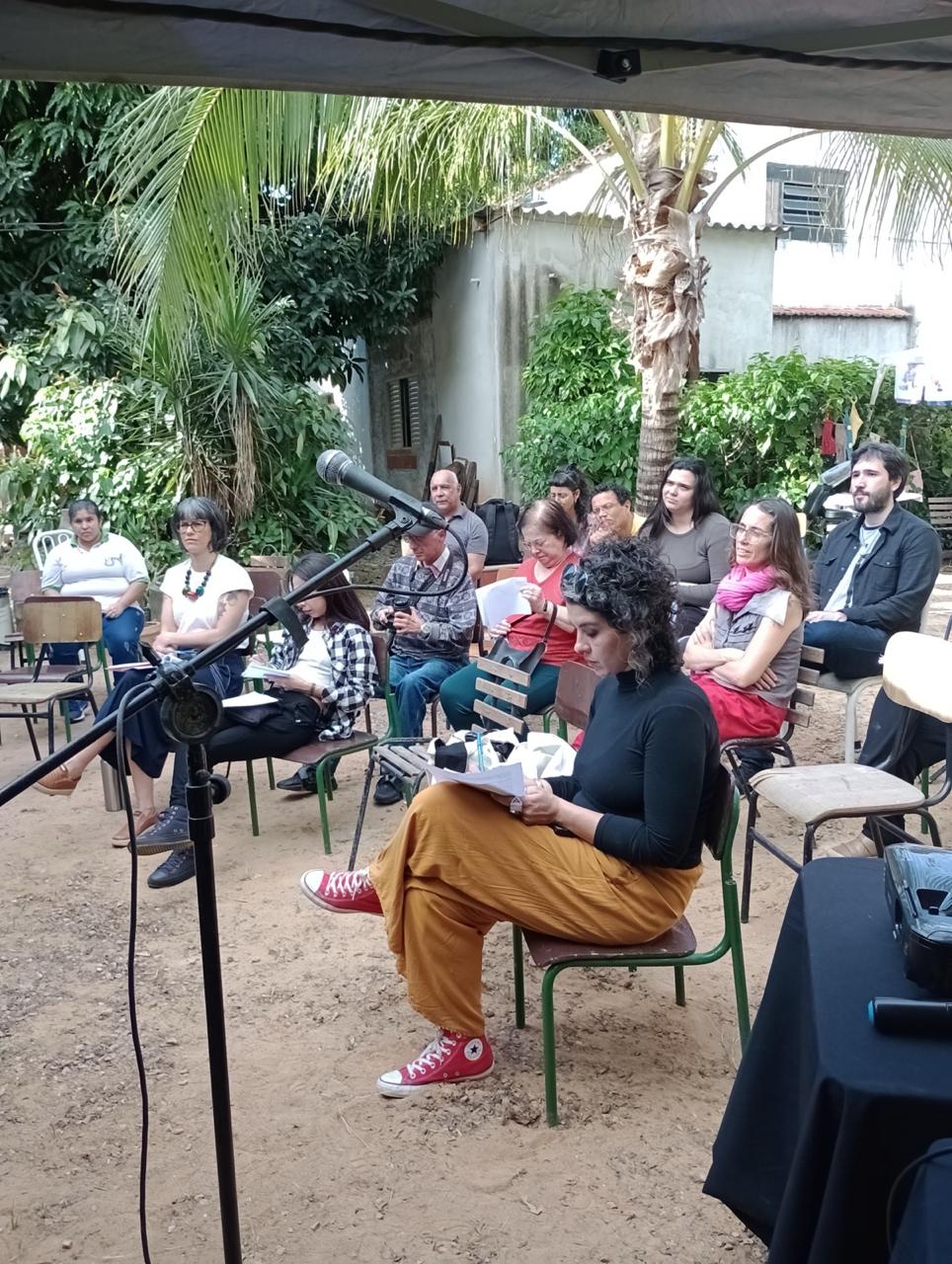 O tema proposto para Júnia Botelho, representante do Instituto Ruth Guimarães, foi sobre a ancestralidade, ou mais precisamente: uma palestra sobre os saberes ancestrais, oralidade e produção de memória. As moderadoras foram a doutoranda Gabriela Botelho e a sra. Aparecida Donizete. Não por acaso, Gabriela e Júnia são parentas, a prima Gabriela, neta de primo, distante no tempo, mas de uma proximidade trazida pelos ancestrais, de uma voz que escutamos e não sabemos de onde vem. Aparecida fez perguntas muito pertinentes. Nem sempre temos respostas para todas as questões, mas nem por isso elas devem deixar de ser colocadas. A dor é ancestral? Não sei, mas certamente a felicidade é. A felicidade de ter comigo, a meu lado, como um apoio, Gabriela, que nem era Botelho, nasceu Ferreira e foi mudando seu nome ao longo do tempo. Por quê? Porque era assim que tinha de ser. E porque assim foi. Doemos, sim, choramos, sim, e isso não deve ser esquecido. Mas a dor ancestral não deve doer somente para nos fazer chorar, cantemos, dancemos, porque temos esse banzo, esse profundo sentimento de melancolia e saudade da terra natal, da família e da liberdade, que faz parte de nossa história e de nossa pele, sentimos, mas não podemos morrer por ele – devemos viver por ele e fazer disso um passo para ir além e fazer viver nossa história de outra maneira.